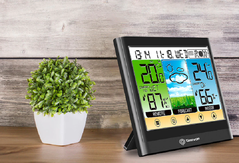 Funções: temperatura interior e exterior, higrómetro, despertador duplo, data, hora, indicador de bateria fraca, previsão do tempo