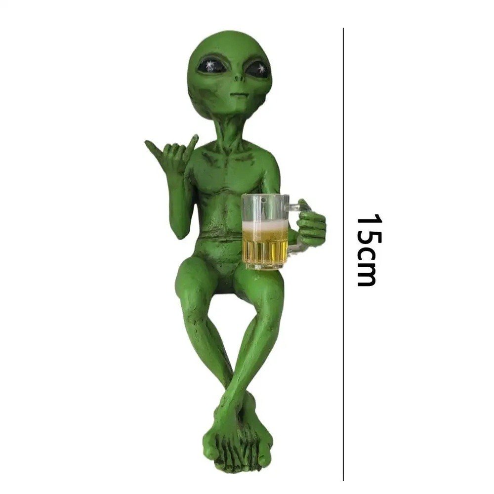 Estátua decorativa de extraterrestre sentado com cerveja 15 cm Figura de plástico Decoração sci-fi engraçada para mesa prateleira presente original