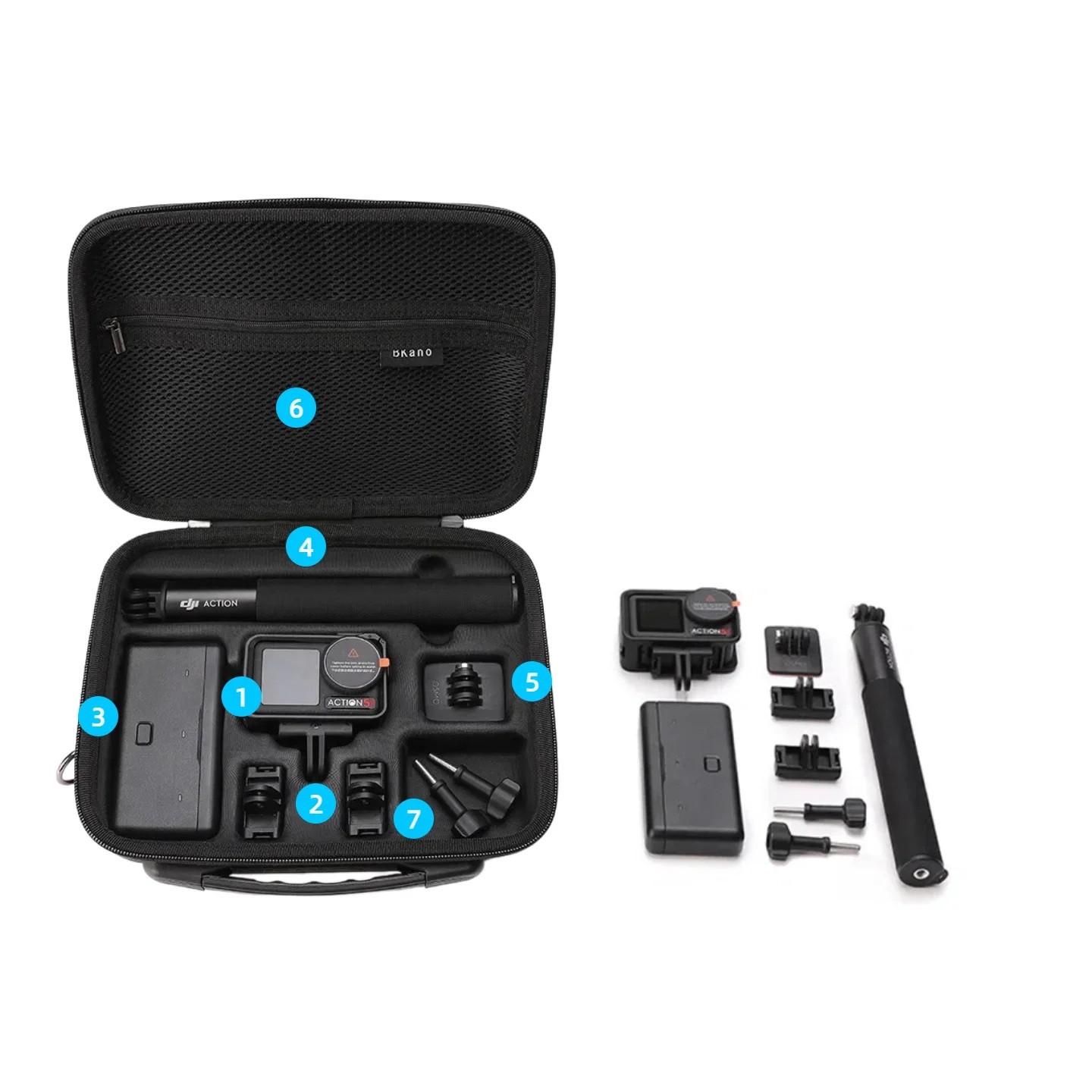 Estojo EVA resistente concebido para o transporte seguro e proteção da câmara de desporto DJI Osmo Action durante viagens e uso diário. Descrição completa