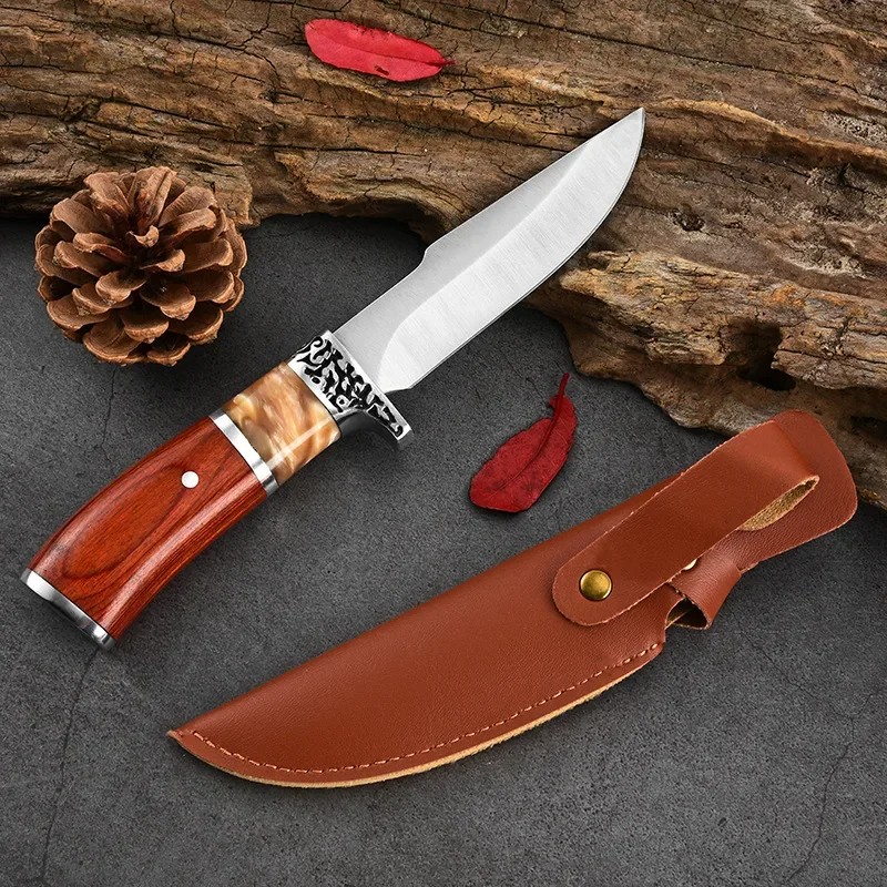 Faca de campo reta de 20 cm com lâmina em aço inoxidável e cabo em madeira e resina Tático faca de sobrevivência com estojo Camping