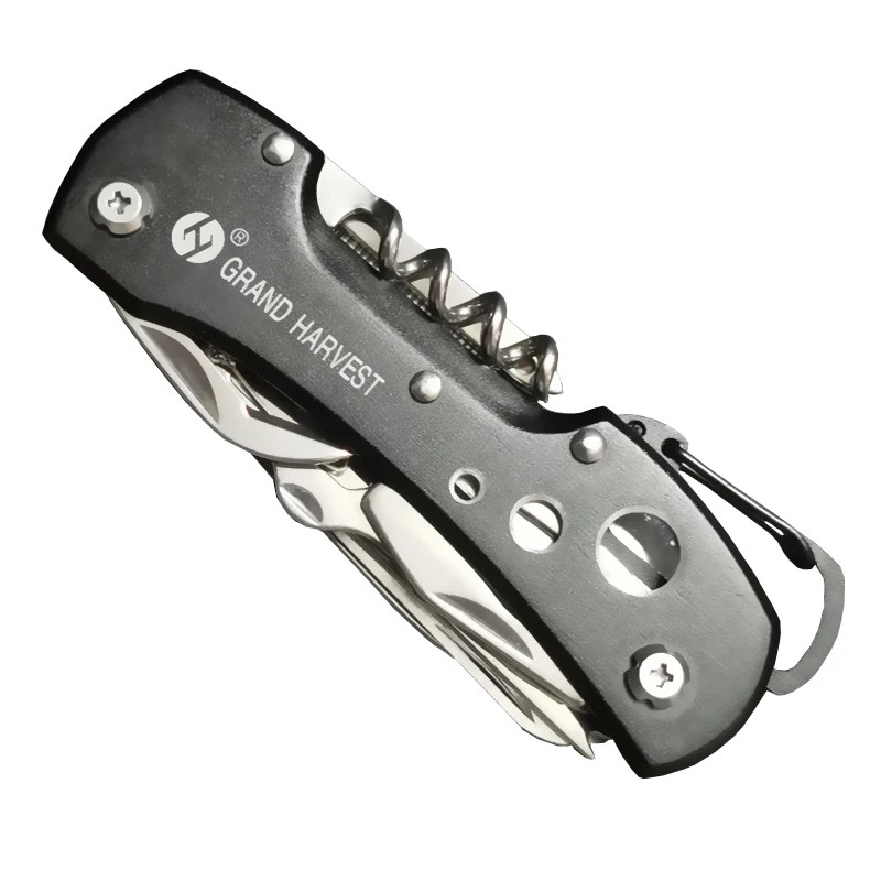 - 11 funções num só utensílio – faca, saca-rolhas, tesouras, lima, chave de fenda Phillips, abridor de latas e garrafas, gancho, 2 serras
