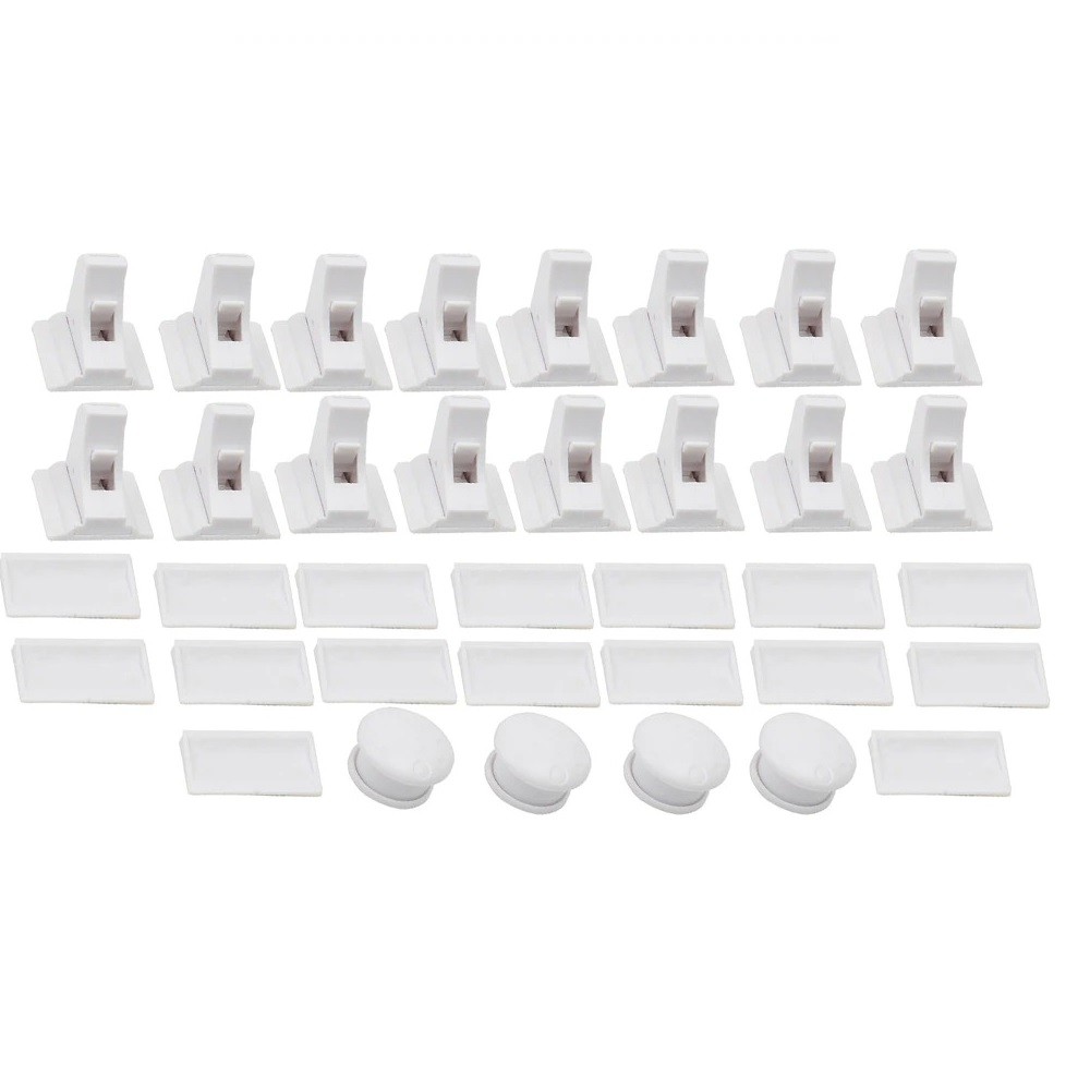 Material: plástico. Dispositivo de segurança para portas e gavetas. Descrição completa