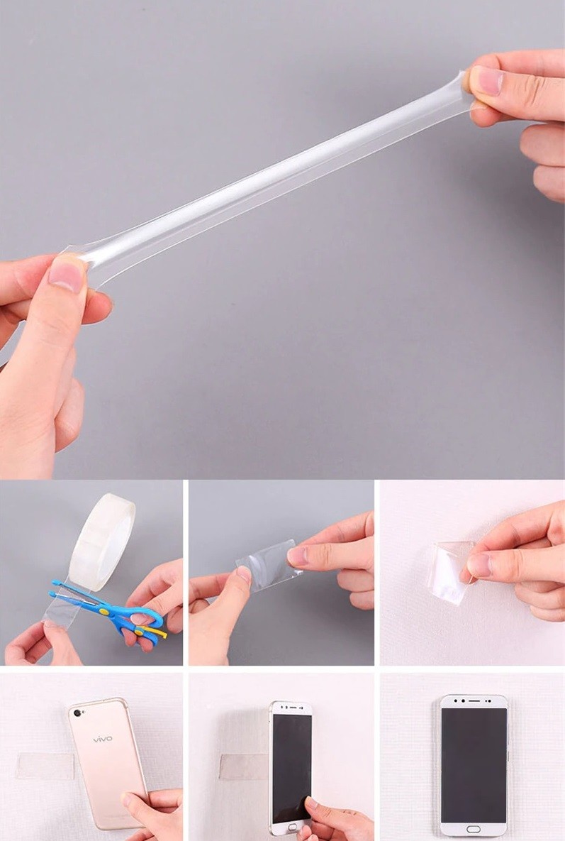 Fita adesiva transparente e dupla face. A fita é lavável e reutilizável. Aplicável em qualquer superfície - parede, vidro, madeira etc. Um auxiliar ideal se deseja fixar algo de forma fácil, segura e sem furar. A fita adesiva é também à prova de água. Tem uma largura de 20 mm.