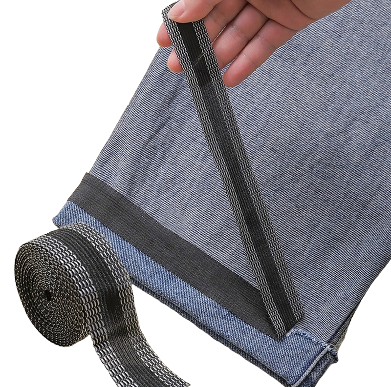 Esta fita ajuda a encurtar ou fazer bainhas em calças, mangas ou saias, sem necessidade de costura. Basta ter apenas um ferro de engomar e umas tesouras. Coloque a fita na dobra, passe o ferro quente e depois corte o excesso da fita.