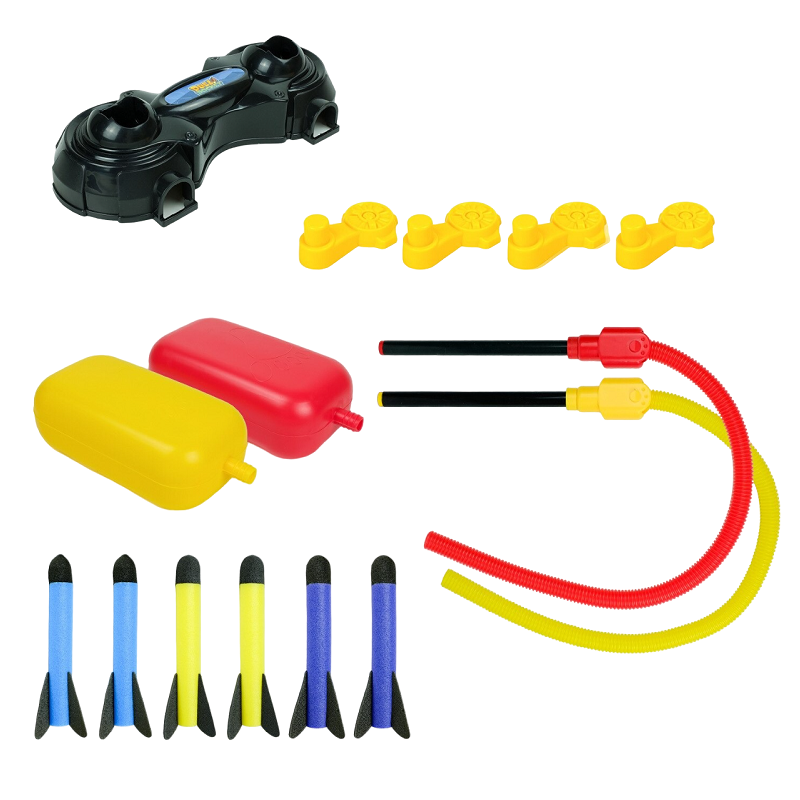Conteúdo da embalagem: 1x base, 4x suporte da base, 2x bomba, 2x mangueira, 6x foguete