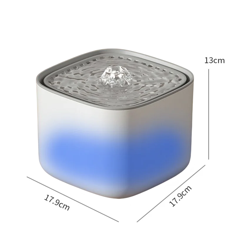 Fontânea silenciosa para gatos com 3L de capacidade, alimentação USB, luz e prevenção de queimaduras. Promove a hidratação, purifica a água e reage ao movimento. Descrição completa