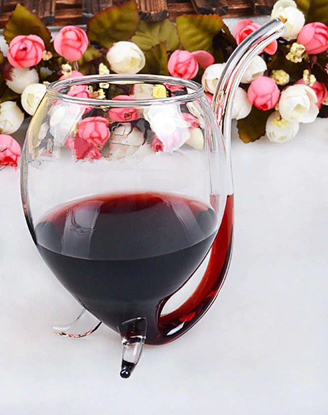 Ao frasco está anexado um canudo de vidro para uma bebida confortável.