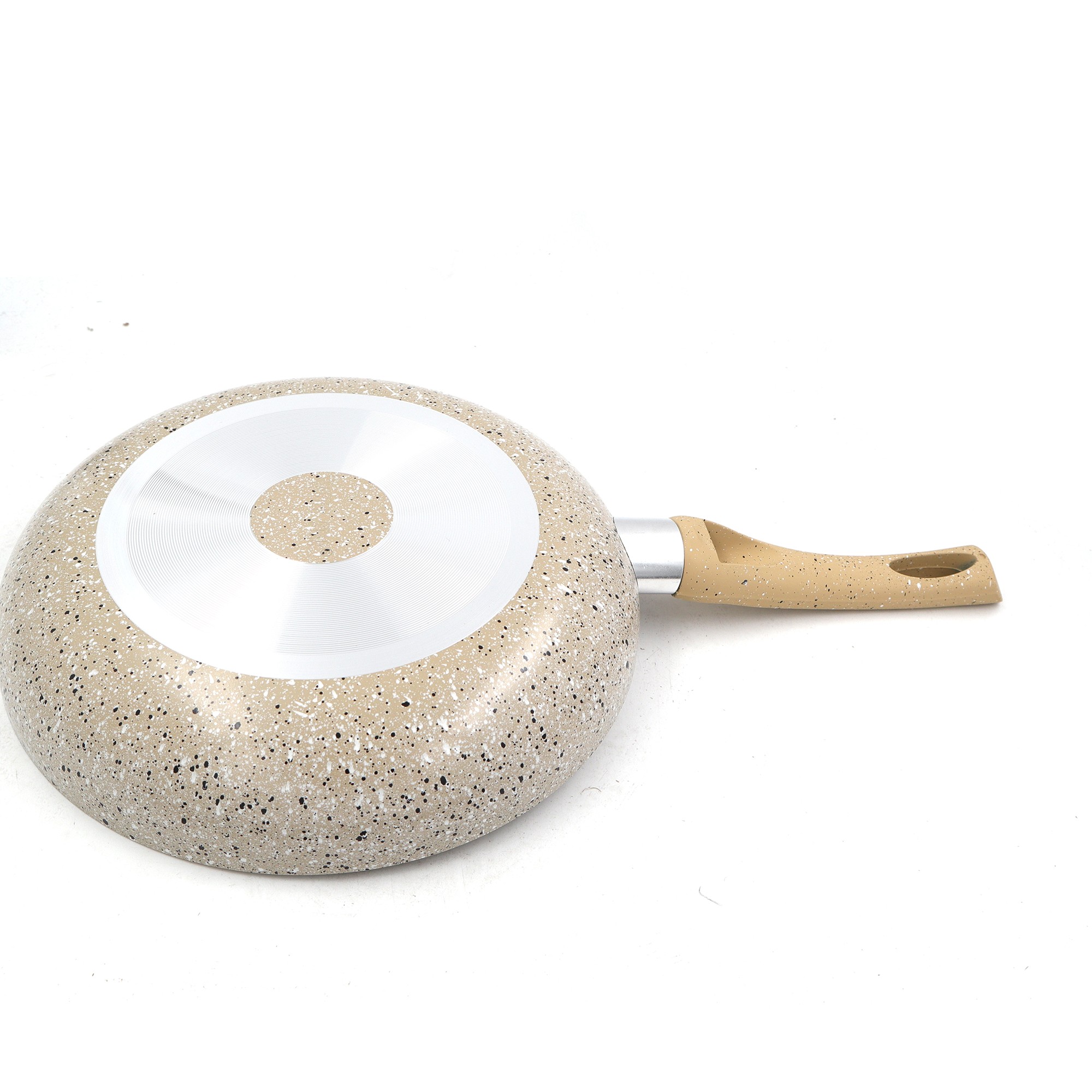 A frigideira tem uma camada antiaderente de granito.