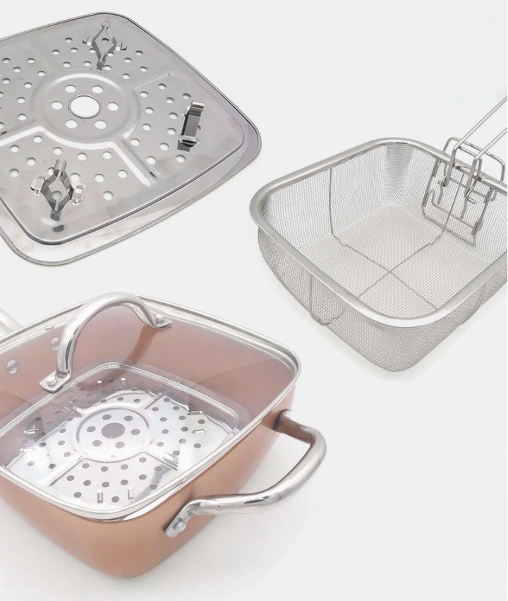 Conteúdo da embalagem: 1x frigideira multifuncional com tampa, 1x cesto de fritura, 1x vaporizador