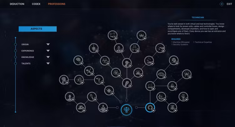 Gamedec imita a natureza dos RPGs de mesa ao focar no desenvolvimento de personagens através da tomada de decisões. Reúna aspectos e crie o seu conjunto único de profissões que lhe permitirá conduzir investigações de uma forma que se adeque ao seu estilo. Descubra as extraordinárias relações entre os mundos virtuais e os seus habitantes através das informações reunidas no seu códex.