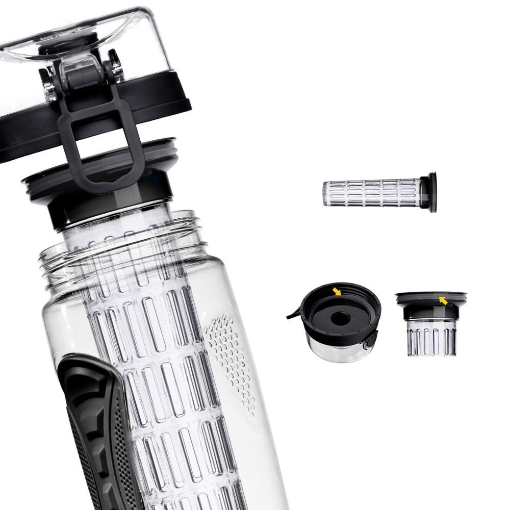 A garrafa tem um filtro adequado para frutas e um mecanismo de fecho na tampa.