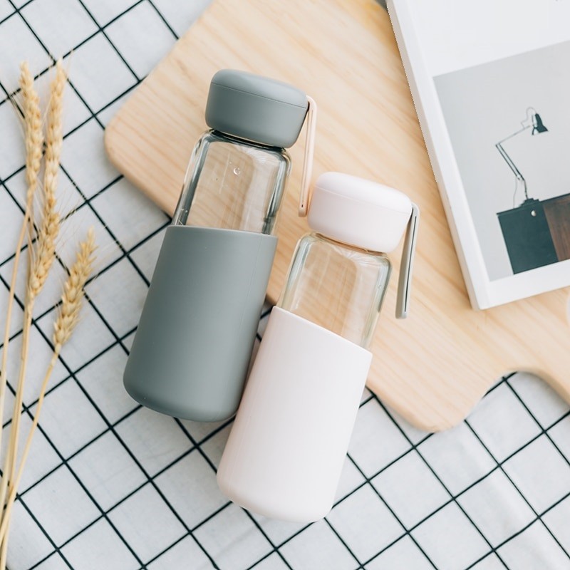 A garrafa tem um corpo de vidro e uma capa de silicone, que a torna fácil de segurar.