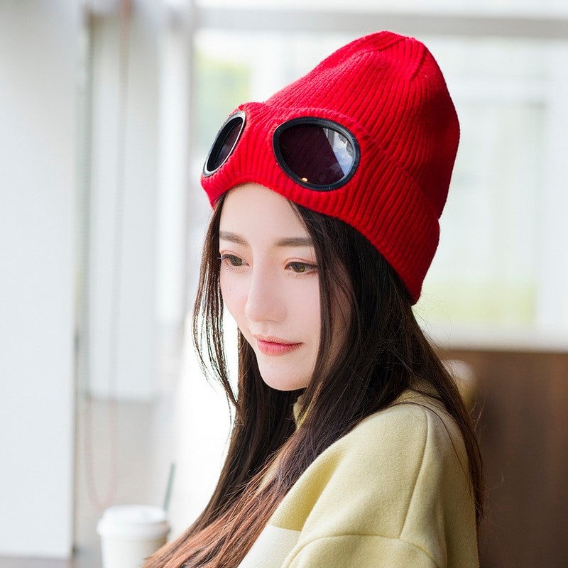 Original gorro de inverno com óculos.