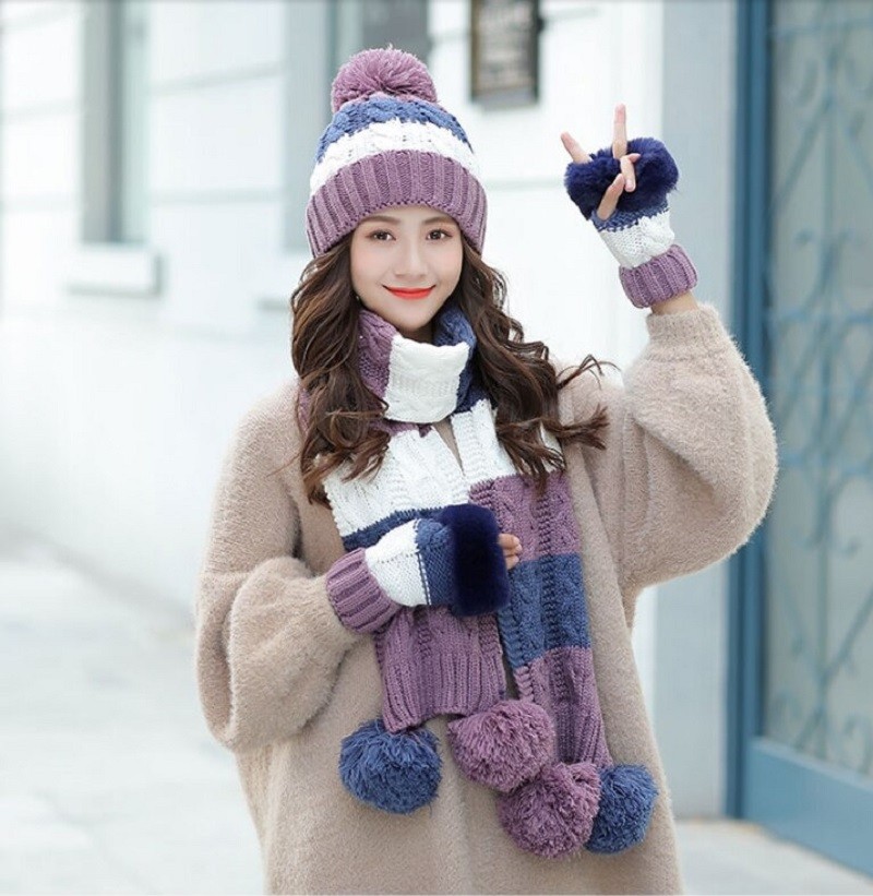 Gorro de Inverno Feminino com Cachecol e Luvas