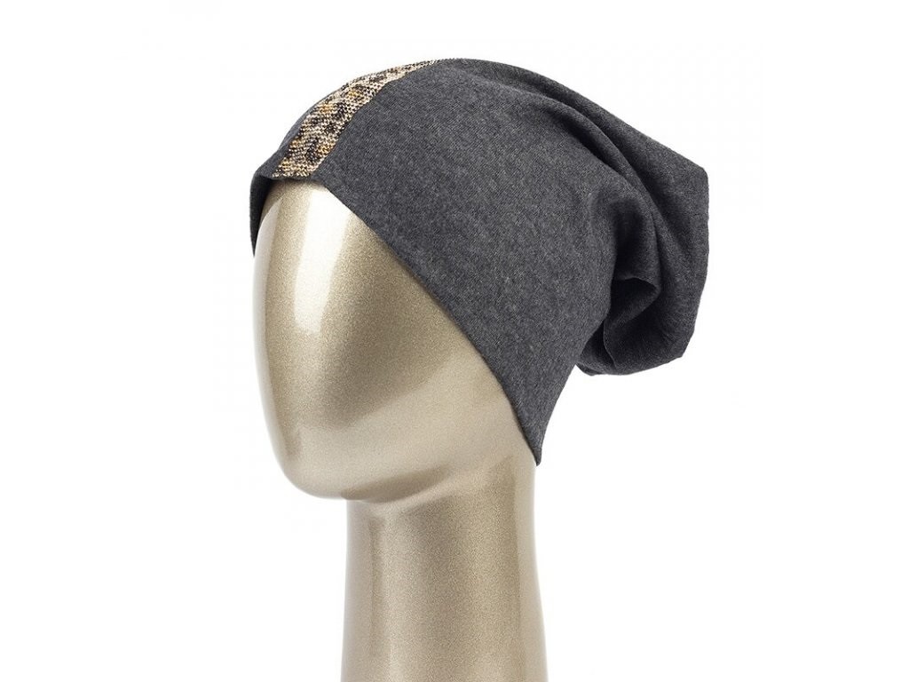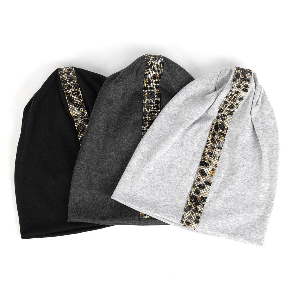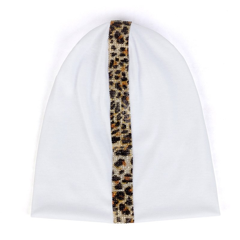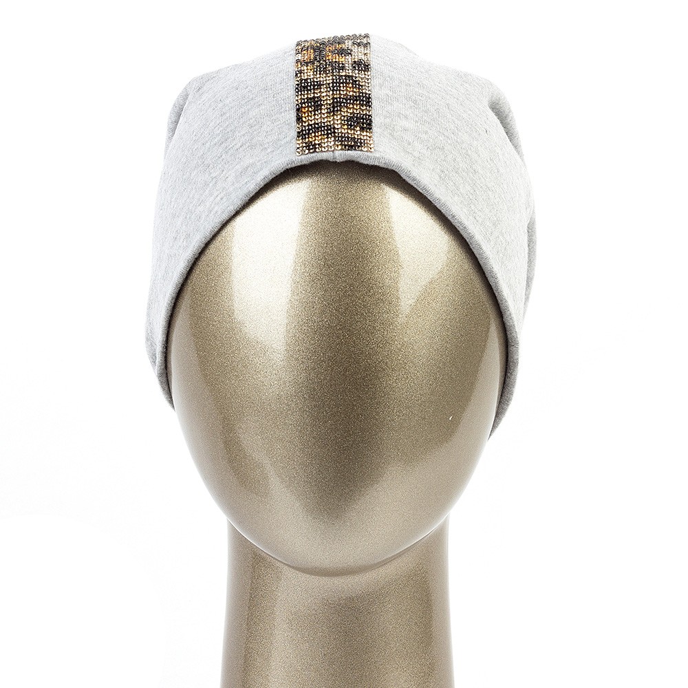 Gorro feminino no estilo beanie com aplicação de pérolas em padrão de leopardo.