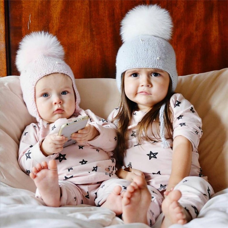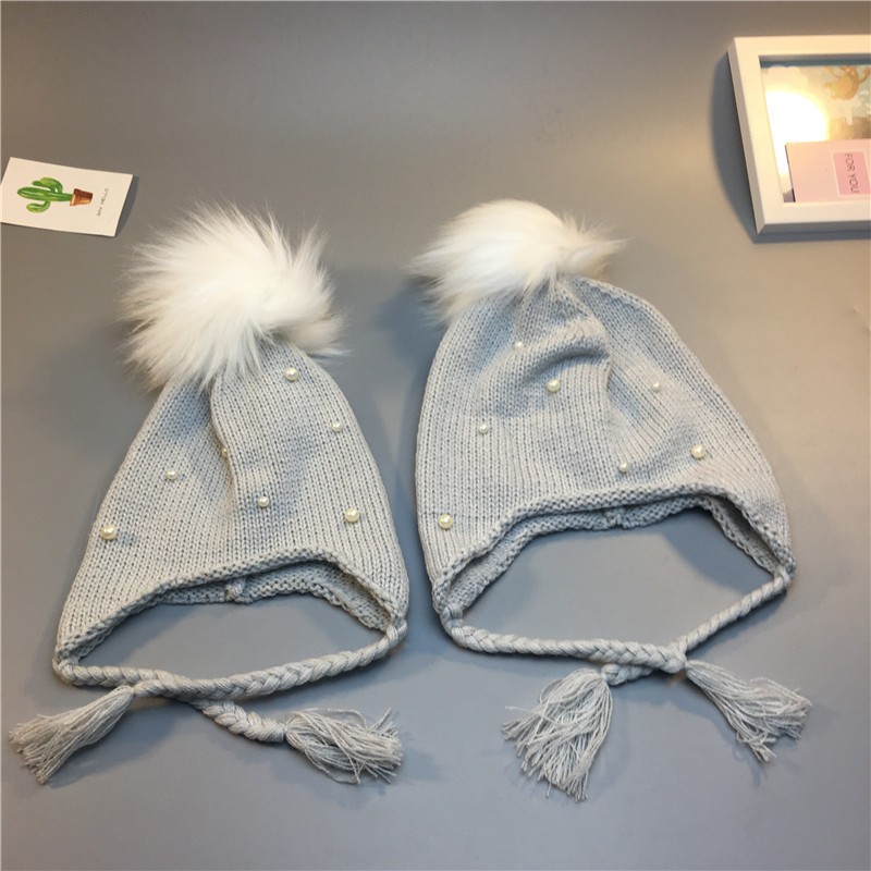 Tudo o que o seu filho precisa para o inverno: um gorro com pompom, pérolas e tranças nas laterais.