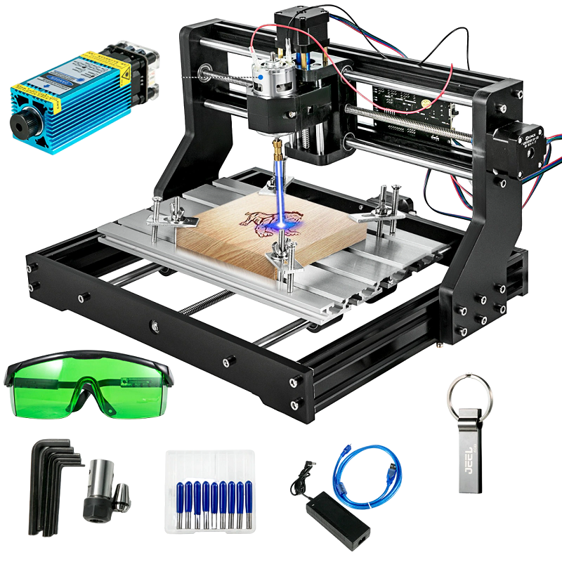 Conteúdo da embalagem: 1x módulo laser, 1x fuso, 1x disco, 1x conjunto de fresas, 1x óculos de proteção, 1x cabo USB, 1x fonte de alimentação, 1x conjunto de ferramentas, 1x pincel