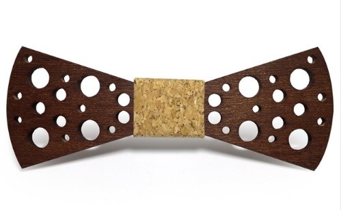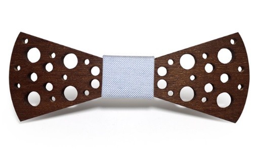 Gravata borboleta de madeira na cor castanho escuro e com uma fita decorativa ao centro.