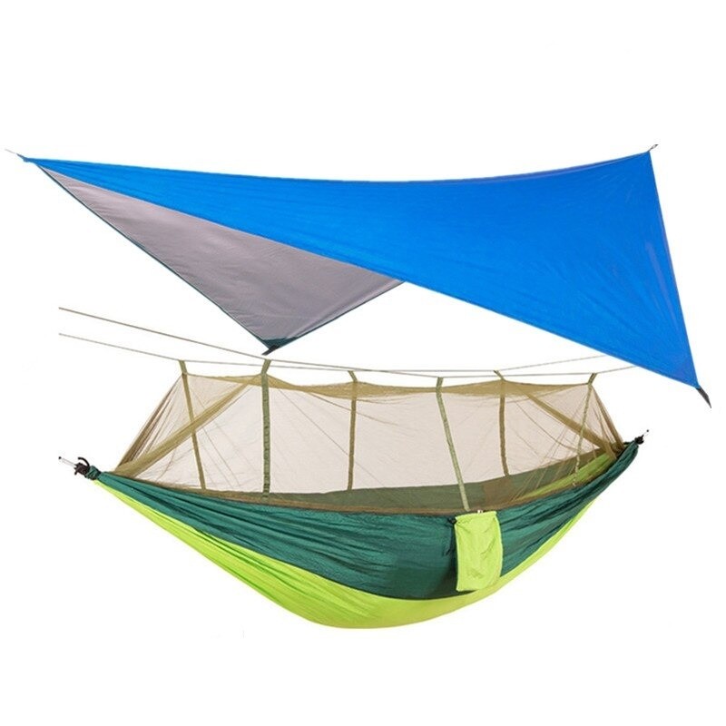 Esta hamaca é um excelente auxiliar para qualquer viajante. A hamaca está equipada com uma rede contra mosquitos e uma lona contra o sol ou a chuva. É fabricada em material muito resistente e de qualidade, sendo adequada para duas pessoas.