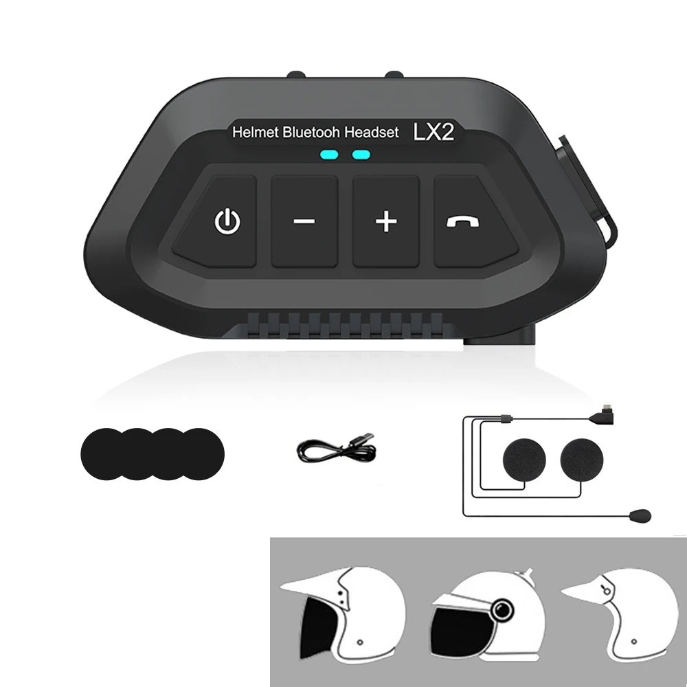 Headset Bluetooth LX2 com microfone fixo IP67 autonomia de 12 h controlo por botões para capacetes abertos sem intercomunicador