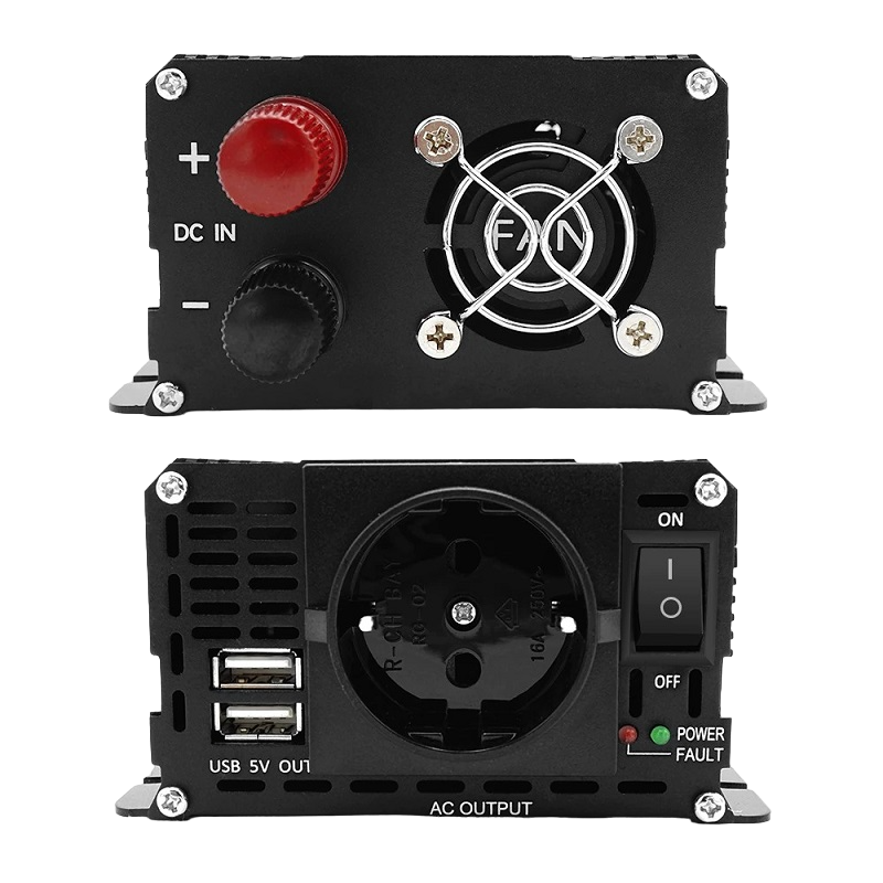 Mudança de tensão: 12 V para 220 V. Potência contínua: 750 W. Potência de pico: 1500 W. Dimensões: 22,1 x 11 x 6 cm. Equipamento: conector USB. Descrição completa