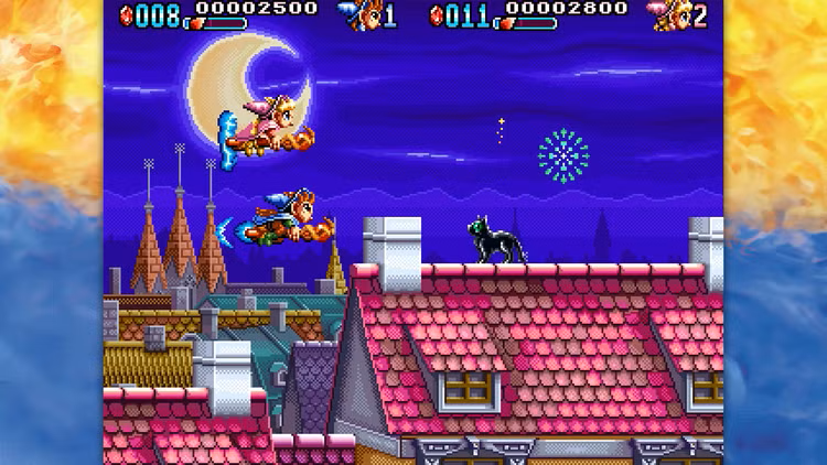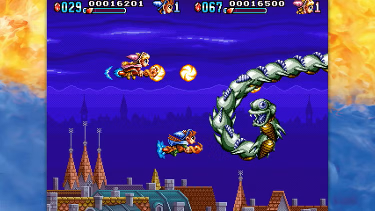 A magia encontra-se com o caos no jogo Mystic Riders, um shooter de fantasia de 1992, onde anda em vassouras e luta contra enormes tartarugas celestiais, demónios de fogo e outras criaturas míticas. Use a sua vassoura como um bumerangue para bloquear projéteis, desviar de obstáculos perigosos e atravessar mundos pulsantes. Não se aventure sozinho – junte-se no modo cooperativo local como o feiticeiro Mark ou a feiticeira Zeal e embarque numa encantadora viagem pela história dos jogos de arcade.