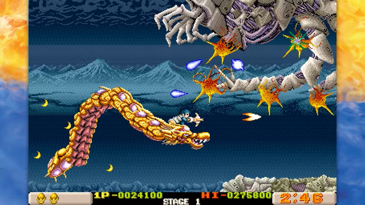 E finalmente, de vassouras a dragões – o clássico arcade de 1989, Dragon Breed, irá lançá-lo numa pesadelo biomecânico! Entre em batalha montado no poderoso dragão Bahamoot, que pode protegê-lo do perigo e queimar tudo o que estiver no seu caminho. Imagine R-Type a encontrar uma apocalipse de fantasia – com asas.