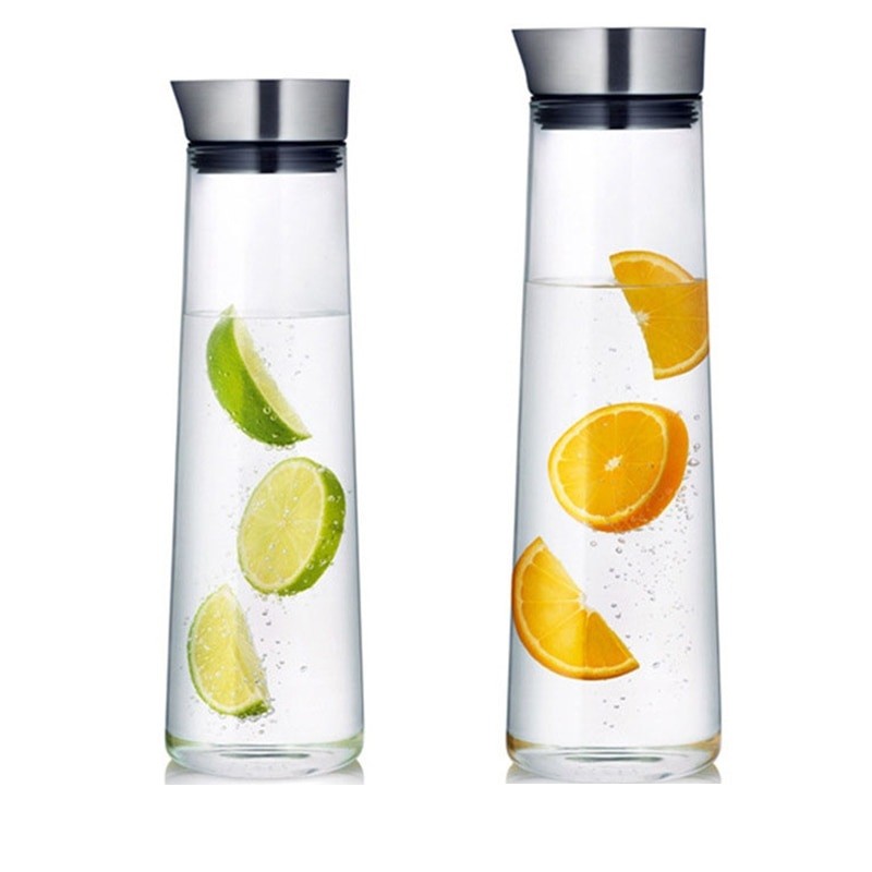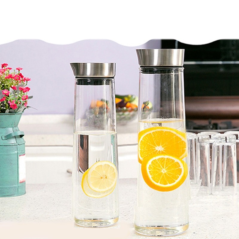 Jarro alto com corpo em vidro e tampa em aço inoxidável.