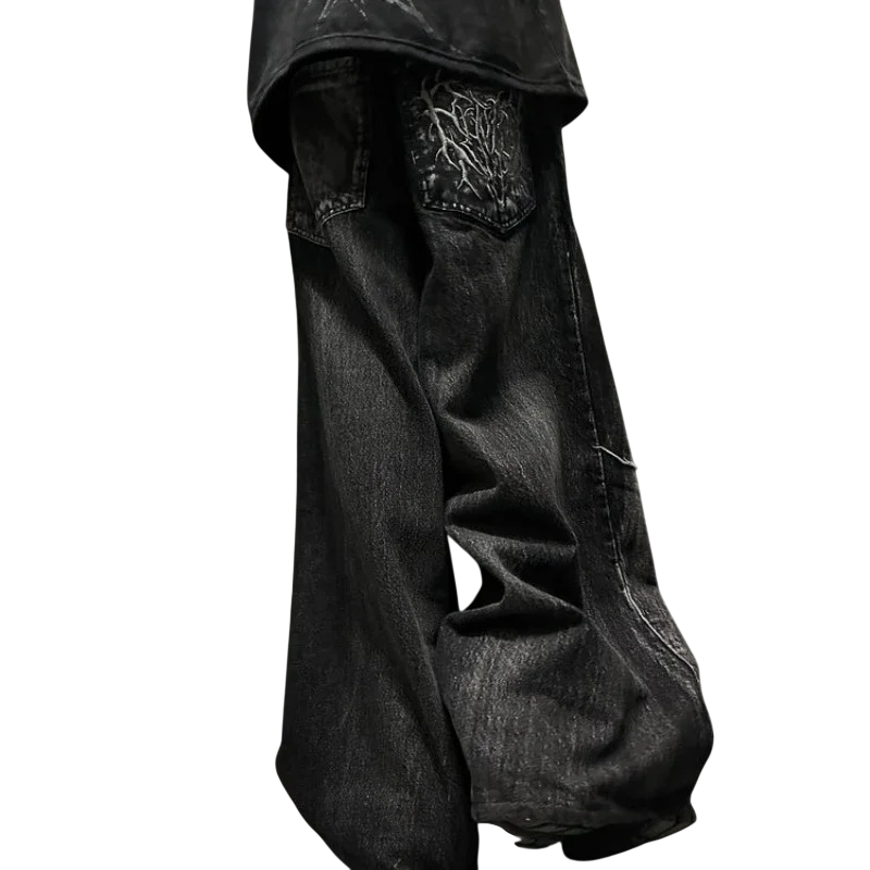 Jeans masculinos pretos com estampado original de aranha, corte solto, cintura baixa, com bolsos. Fabricados em denim de qualidade, ideais para um look estiloso. Descrição completa