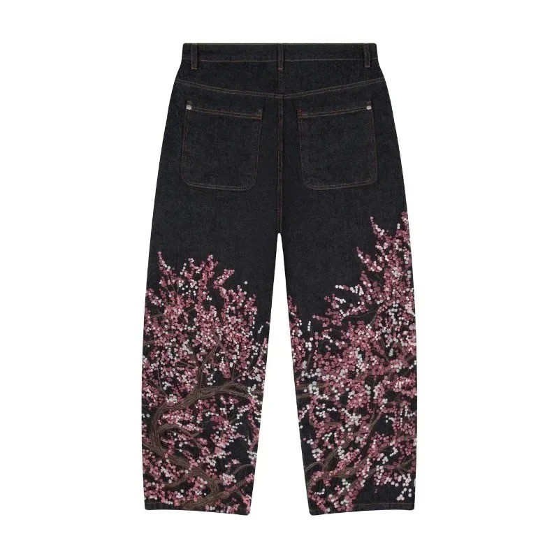 Jeans masculinos pretos com estampado de árvore em flor nas pernas, de cintura baixa, largos, com bolsos, denim