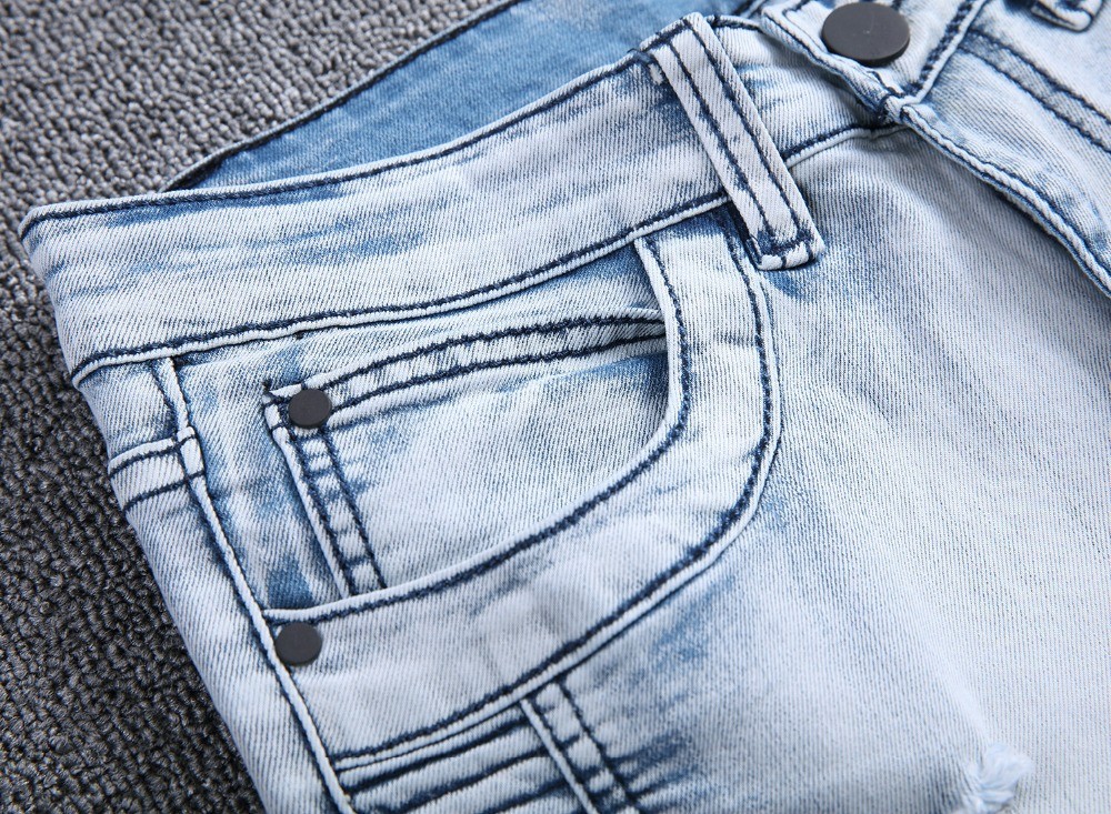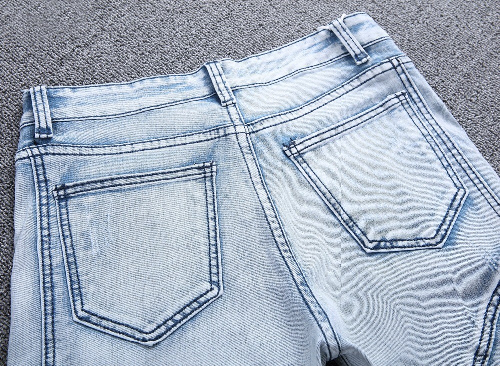 Jeans estilizados, rasgados, para homem, com riscas na parte da frente.