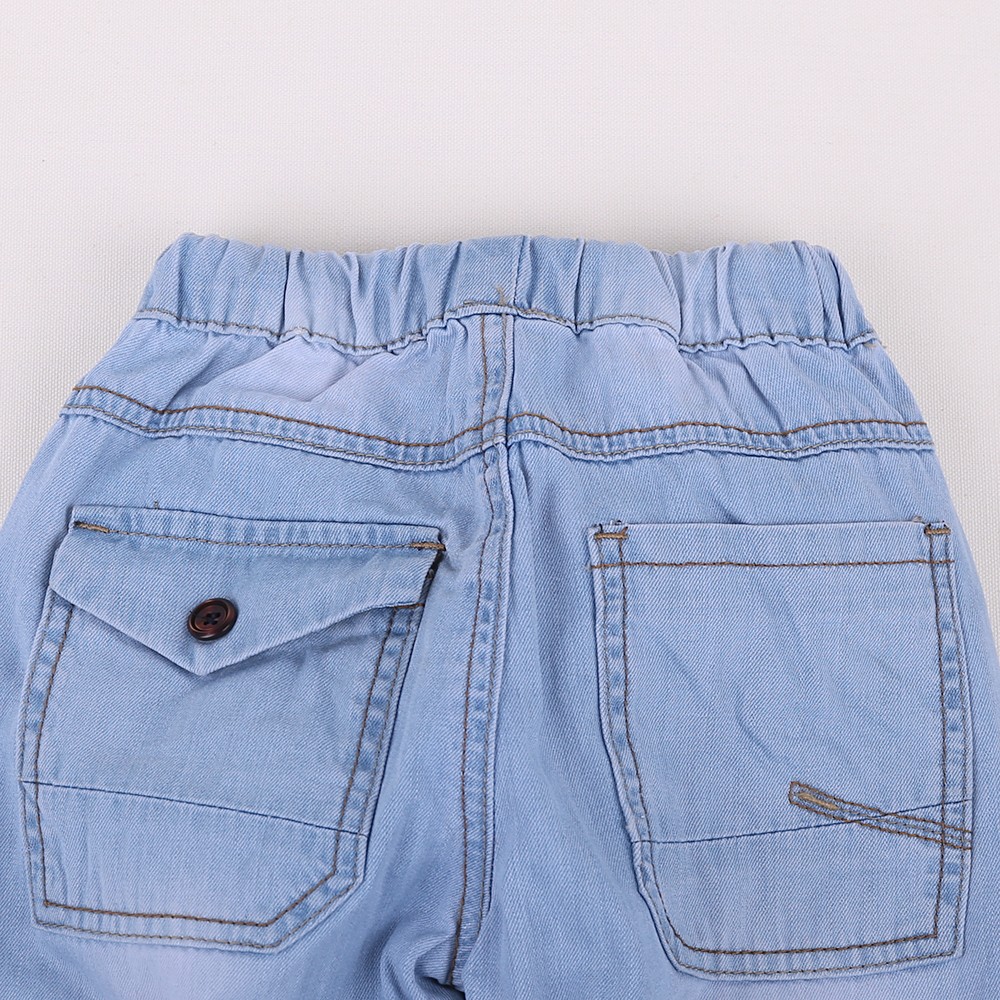 jeans bonitos para rapazes, que não têm botão mas atam-se com cordões.