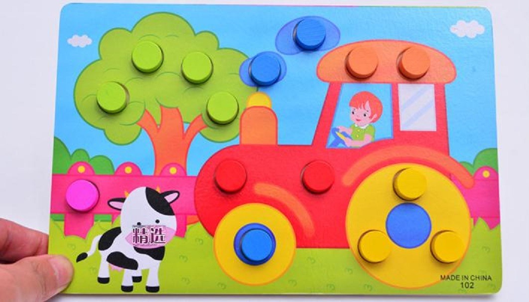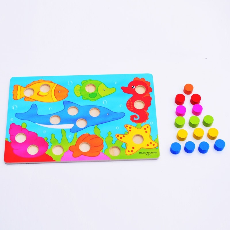 O objetivo é encaixar nos buracos círculos da mesma cor.
