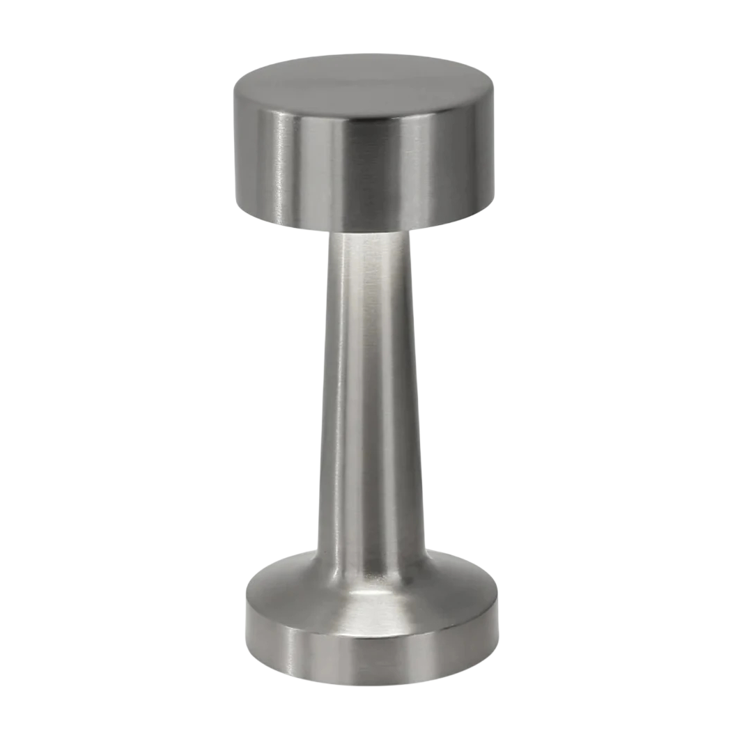 Elegante iluminação de mesa em metal com controlo tátil, três cores de luz e carregamento USB-C, ideal para restaurantes e lares. Descrição completa