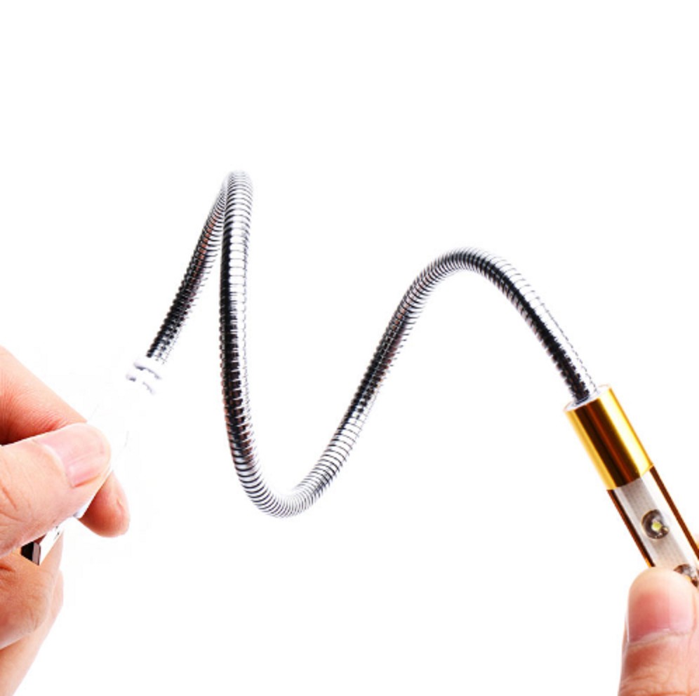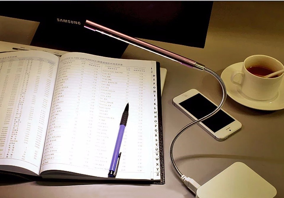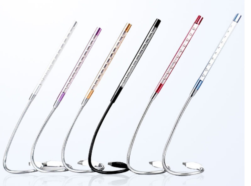 Lâmpada portátil USB para computador portátil com pescoço flexível e ajustável, feito de metal.