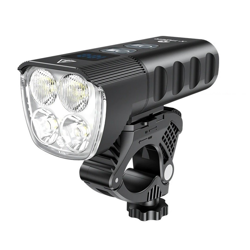 Lanterna LED profissional para bicicleta com alta luminosidade. Proporciona uma iluminação perfeita do espaço à sua frente até uma distância de 300 m. O fluxo luminoso atinge o incrível valor de 2400 lúmens. Além disso, a lanterna está equipada com uma bateria de 6400 mAh, que possui uma enorme duração. Pode ser utilizada também como powerbank. Fabricada em material resistente, que suporta qualquer queda. Resistência à água IP65. Com suporte para guiador. Inclui também cabo de carregamento USB.