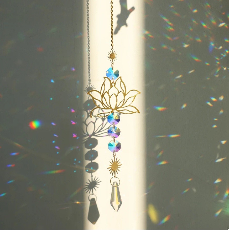 Página inicial Página inicial Casa e utensílios domésticos Decoração e acessórios para casa Pequenas decorações Lapaçã de sol suspenso 41,5 x 6 cm Flor de Lótus Decoração com cristais facetados Reflexos arco-íris Decoração de luxo para janela e varanda