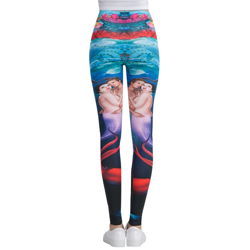 Nas leggings estão diferentes peixes e polvos, mas do outro lado está uma sereia.