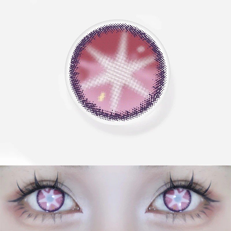 As lentes de contacto coloridas são projetadas para uma mudança marcante na aparência dos olhos com um original padrão de estrela. O centro da lente forma uma estrela contrastante, que cria um efeito inconfundível inspirado no estilo anime. Estão disponíveis em duas variantes – azuis e rosas – ambas com uma suave transição pontilhada e uma borda mais escura para realçar a íris. Este design confere aos olhos uma aparência única e estilizada. As lentes são adequadas para cosplay, fotografia e maquilhagem criativa.