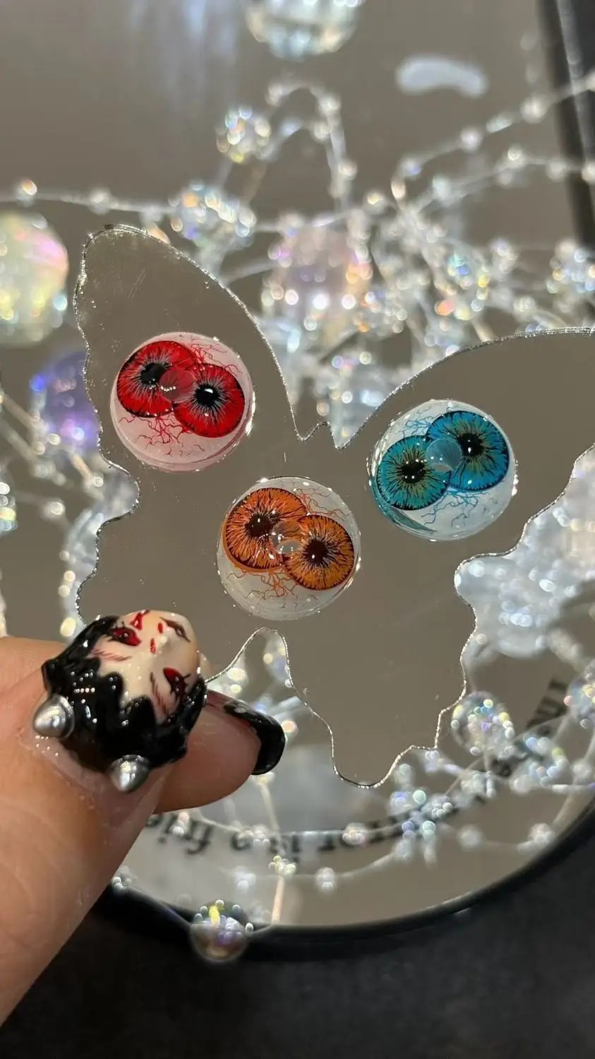 Lentes de contacto coloridas com um motivo marcante atraem pela sua ilustração não convencional da íris e pela disposição incomum dos elementos escuros. O design é composto por um fundo mais claro complementado por círculos escuros irregulares, que criam o efeito de pupila tripla. Este elemento visual é impactante e altera a aparência geral do olho.
