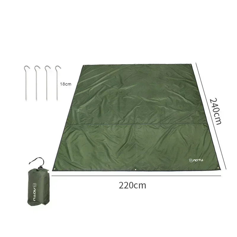 Lona de tenda verde resistente 220x240 cm com ilhós e 4 estacas de alumínio. Ideal para campismo, proteção contra a chuva e o sol. Descrição completa