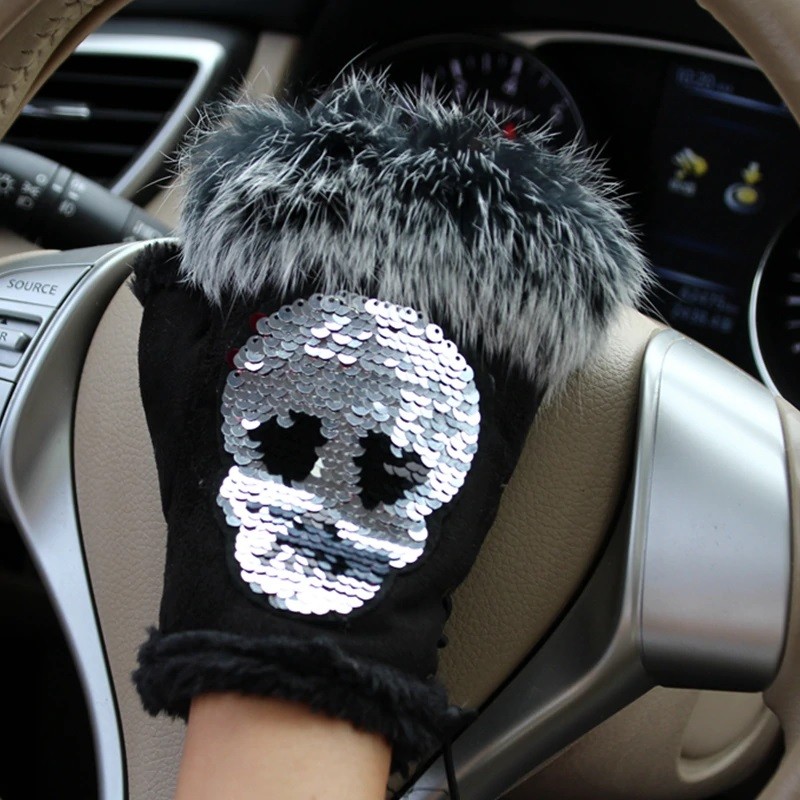 Luvas femininas da moda com lantejoulas em forma de caveira e pelúcia são uma ótima escolha para os dias de inverno.