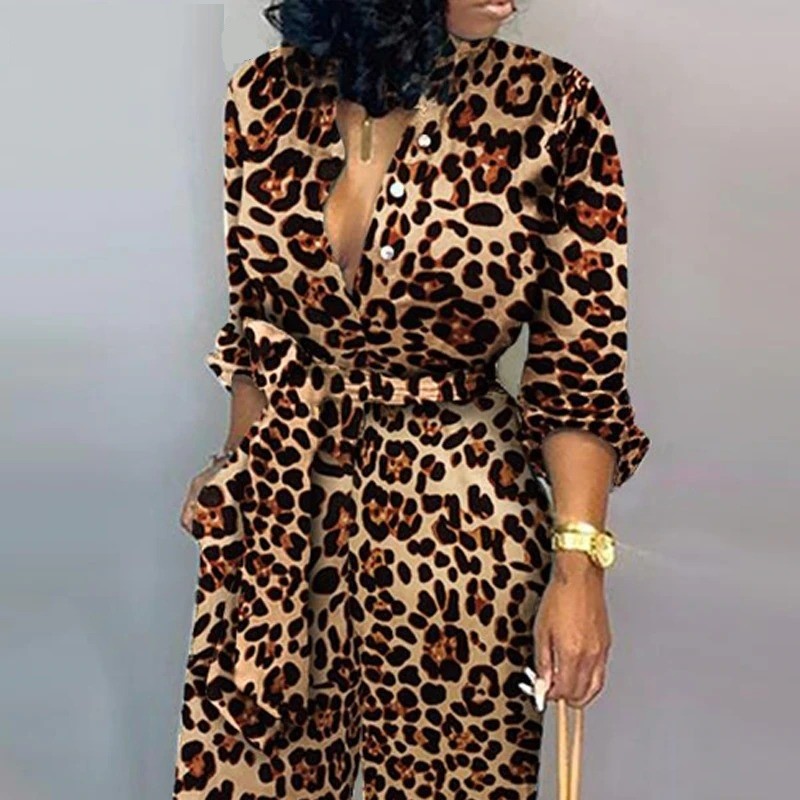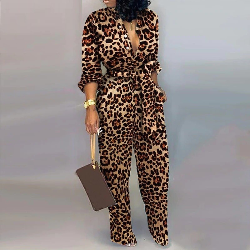 Macacão de leopardo feminino com mangas longas B869