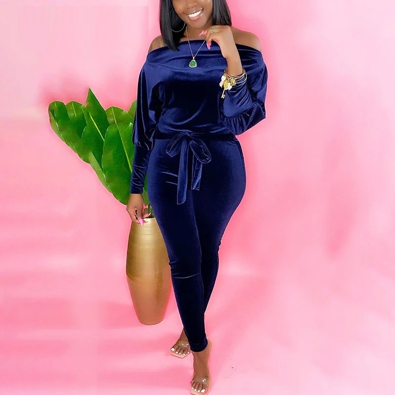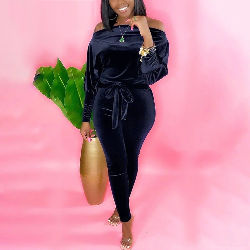 Macacão de veludo para senhora com ombros à mostra