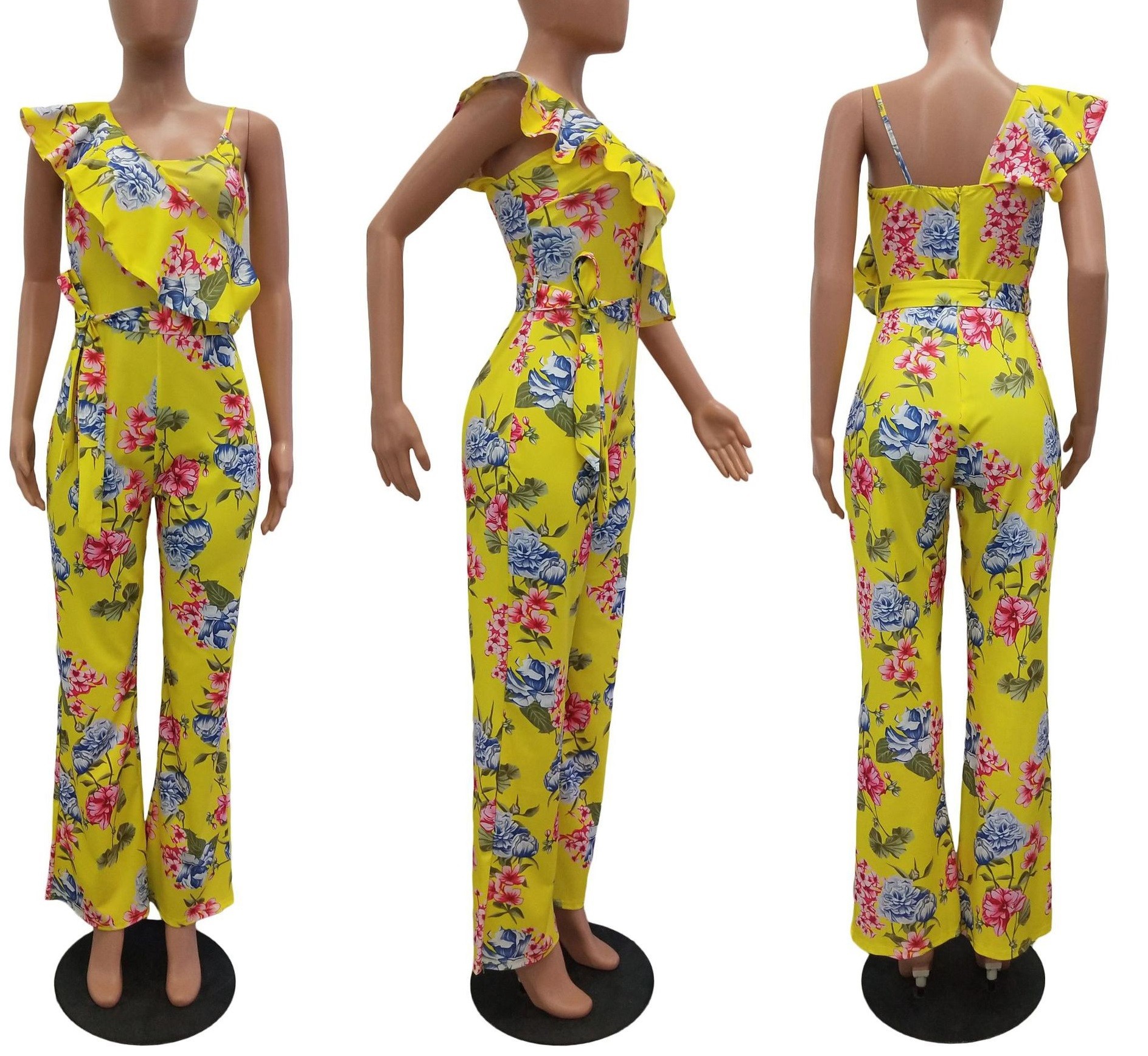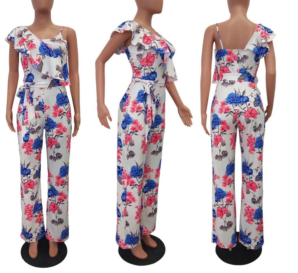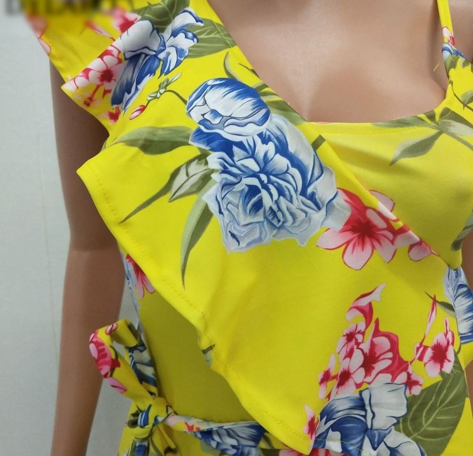 Macacão feminino com padrão floral e folhos