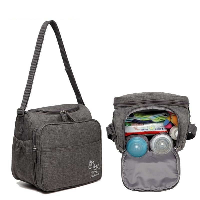 Mala de fraldas e outros artigos para crianças com alça de ombro ajustável.
