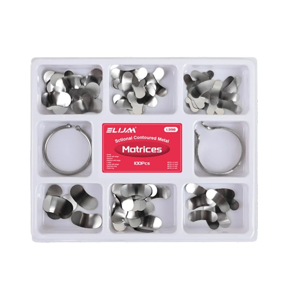 Este conjunto profissional de matrizes metálicas seccionais moldadas para dentes é ideal para a realização precisa e eficaz de restaurações dentárias. O grampo de mola assegura uma fixação estável da matriz durante o tratamento, enquanto o anel separador ajuda a manter a forma ideal do dente e facilita a aplicação do material de restauração. Fabricadas em metal de alta qualidade, as matrizes são resistentes ao desgaste e oferecem uma longa durabilidade. Este conjunto é destinado a uso profissional em consultórios dentários e laboratórios, permitindo um ajuste preciso em cada procedimento.