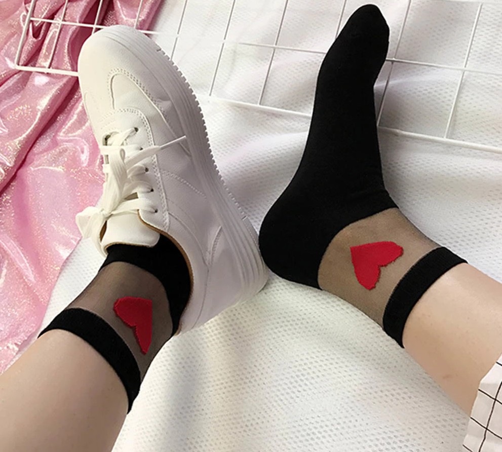 Meias transparentes com um coração dominante no tornozelo interno!