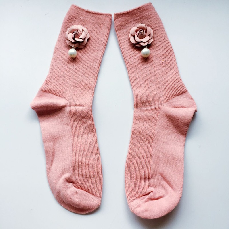 As meias são decoradas com uma bela rosa de tecido e uma pequena pérola.