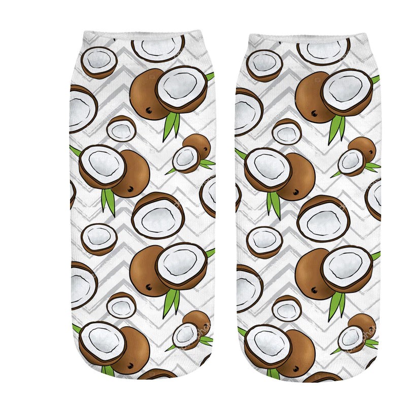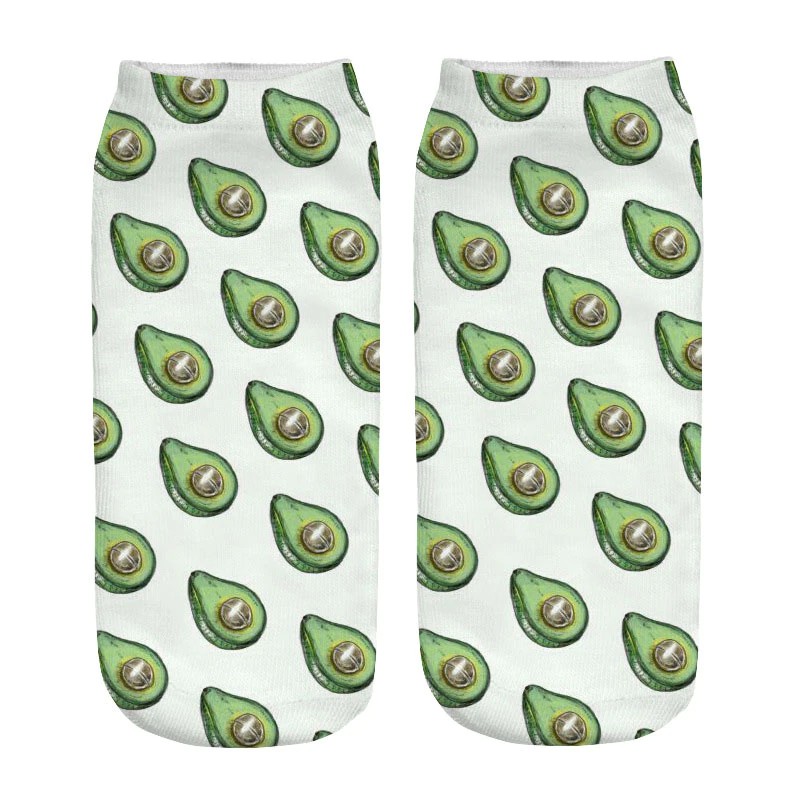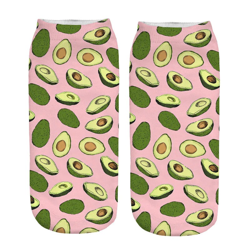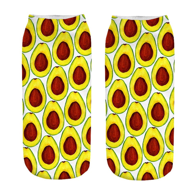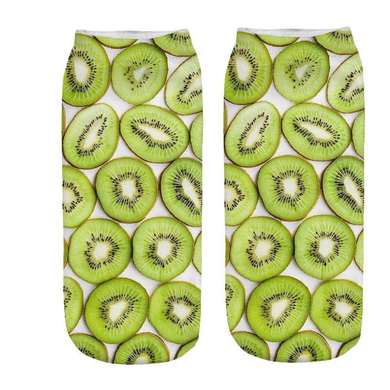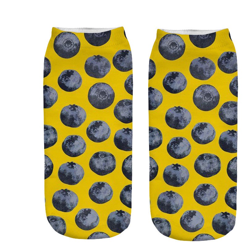 Nas meias estão estampas de várias frutas de todos os cantos do mundo.